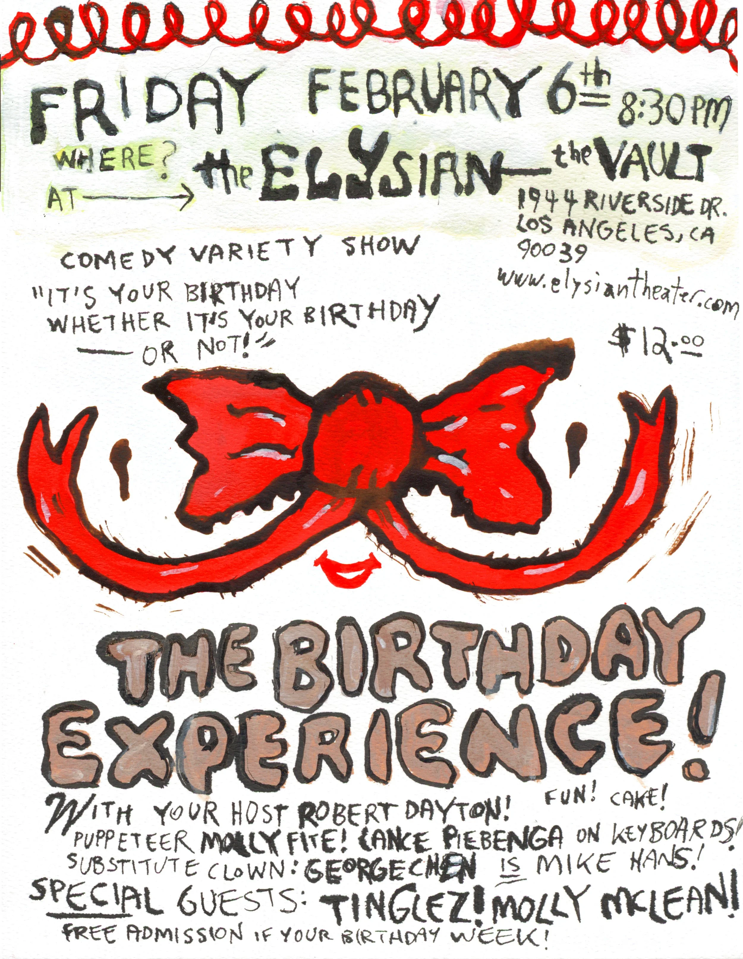 The Birthday Experience features Robert Dayton as your excitable host, wonderful puppeteer Molly Fite with Puppet Molly -a very good dancer, along with bandleader and sparkling keyboardist Lance Piebenga, and substitute clown George Chen as Mike Hans! Yayyyy! A gaggle of new friends for the audience to visit each and every show! This month's very Special Guests are: Megan Koester (comedy!) Simone Turkington (magic!)