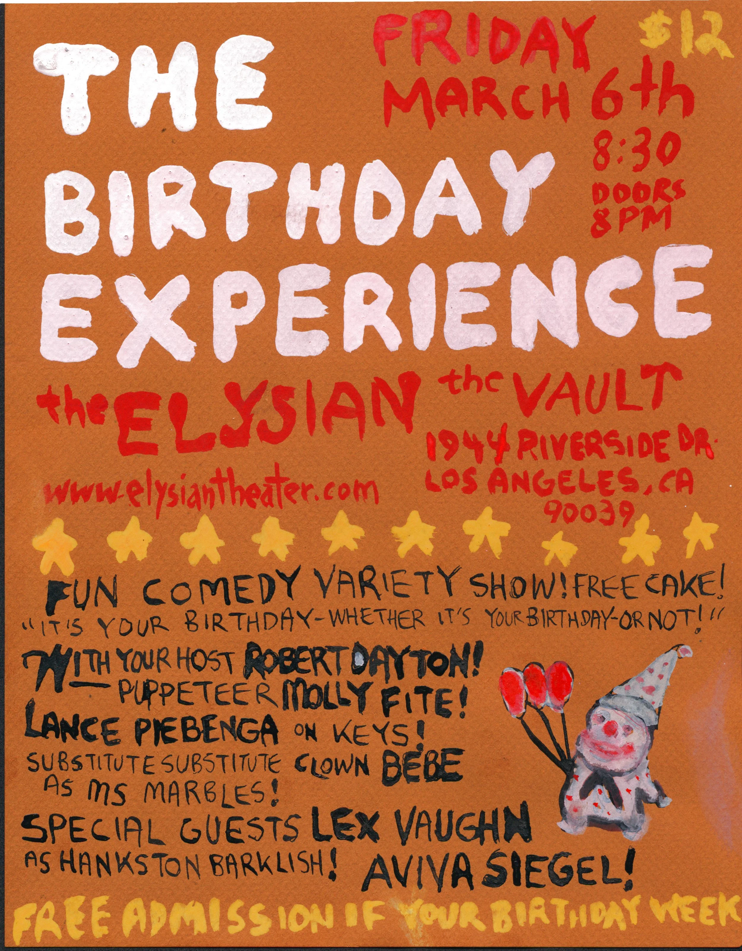 March is shaping up to be exciting. The Birthday Experience is happening Friday, March 6 with some special guests, my pal Lex Vaughn who I knew back in Toronto and Aviva Siegel who does the great show Talkies at Whammy and Bebe is the substitute substiute clown Ms Marbles! Tix: